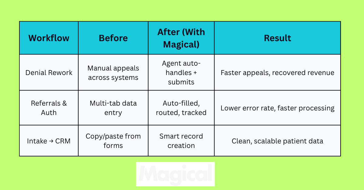 The healthcare admin world is dynamic. Insurance rules change. Fields update. And human oversight is still needed to manage exceptions, of which there are plenty.