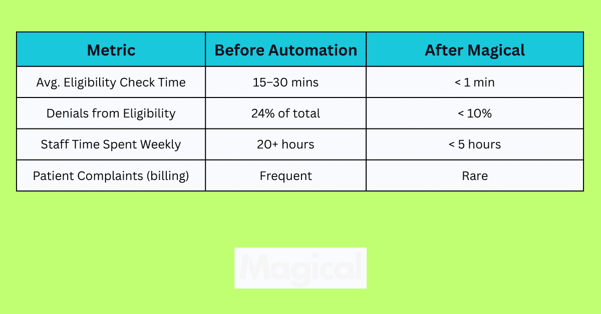 Manual eligibility checks eat up 10–30 minutes per patient, depending on the system and payer.