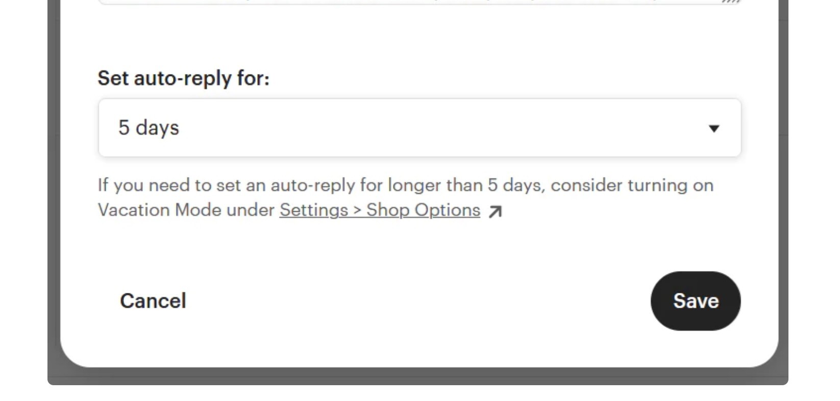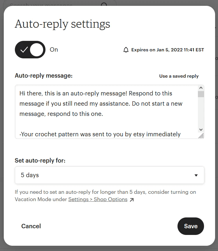 You can have your auto replies set up for up to five days. If you're gonna be unavailable for longer, you should use vacation mode. This keeps your customers happy because they know that you won't respond in a certain time period and they also know that unless your message says otherwise, that you won't be fulfilling orders during this time.