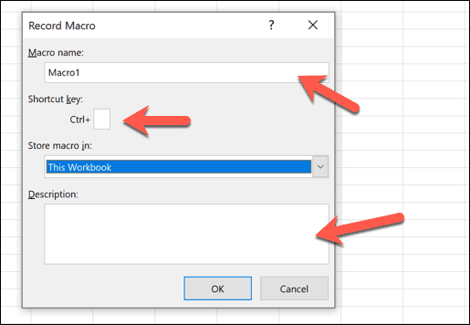 Next, click on 'Record Macro'. A dialogue box will pop up asking for some details like macro name or shortcut key if needed.