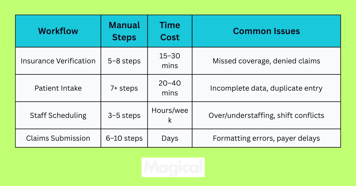If your billing coordinator spends 3 hours a day chasing claim statuses or your front desk is still calling patients to confirm appointments, you’re burning high-cost labor on low-value tasks.