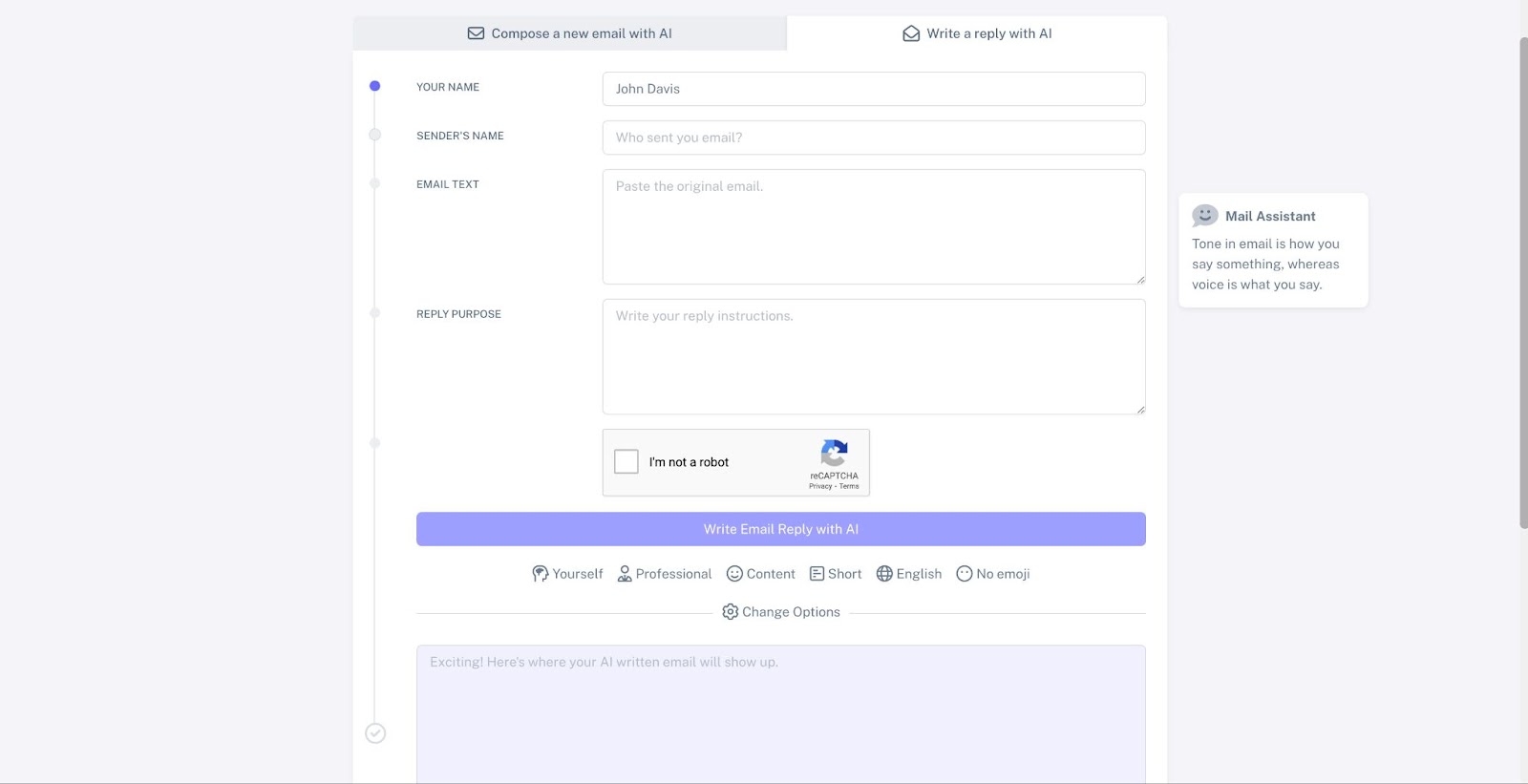 WriteMail is a simple, straightforward AI writing tool that does two things: writing emails and writing e-mail replies. It has features that allow you to adjust the tone and purpose of the e-mail for better input.