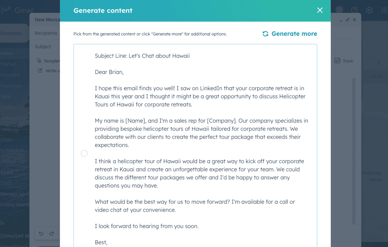 It's easy to create more content for your emails if they're not long enough. Just click generate more to keep going.