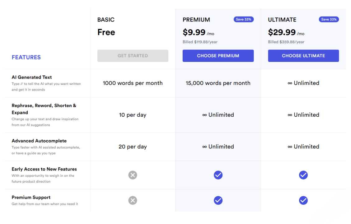 Compose.ai offers a free plan that lets you generate up to 1,000 AI words per month, rephrase 10 words a day, and use the autocomplete tool 20 times a day. The Premium plan costs $9.99 a month and gets you 15,000 AI words per month with unlimited autocomplete and rewrites, and premium support. The Ultimate plan, which costs $29.99 a month, gets you unlimited AI words.