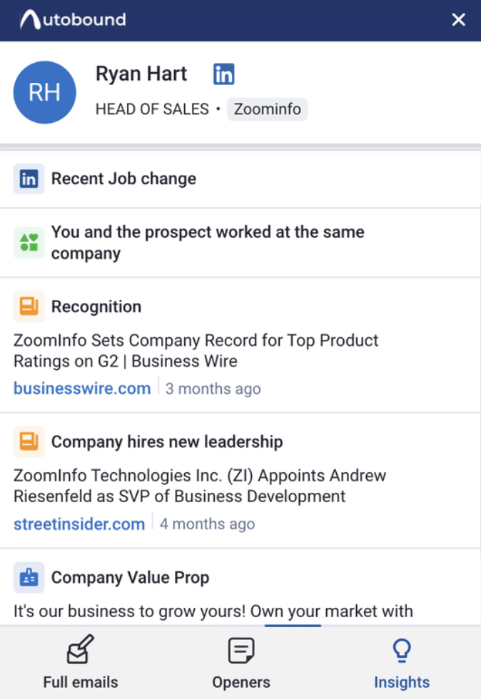 Autobound refers to itself as the "ChatGPT for sales," and after testing the tool, we can vouch for its claims. It’s built a solid AI email writer for sales teams, and we particularly like the Insights feature—it gives you a lot of information related to your prospect, and it'll notify you when they start a new job, for example. Check this out: