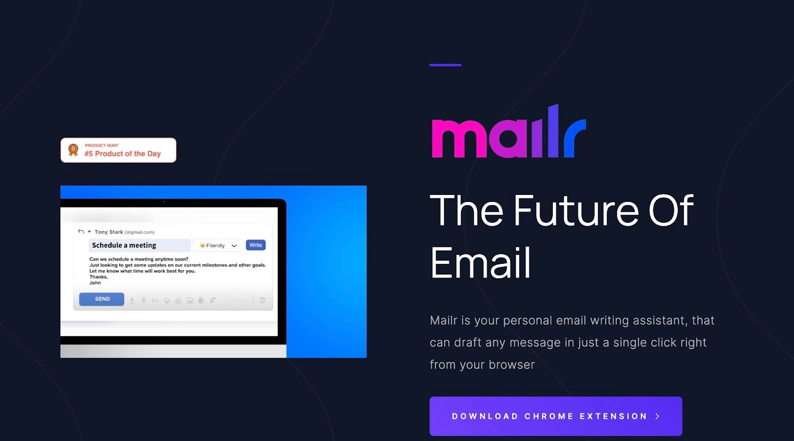 Mailr is a chrome extension that lets you create emails based on inputs you feed it. You can choose the tone and in seconds it generates an e-mail for you.