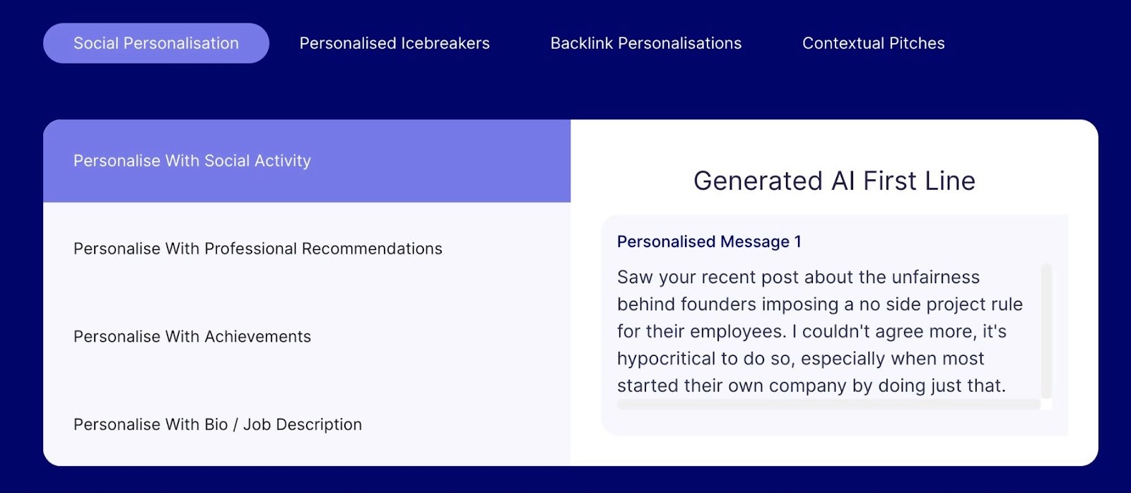 This feature generates short, personalized opener blurbs to help you connect with prospects over LinkedIn messages.