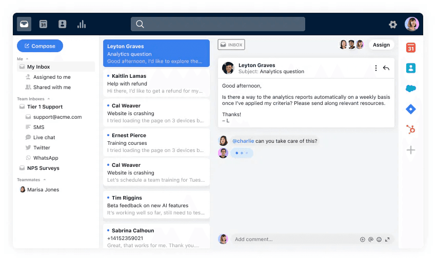 Unlike traditional email inboxes, Front enables team members to work together on responses. Teammates can comment on conversations privately, assign tasks, and share drafts before sending out a final response. This collaborative approach can lead to more accurate and consistent customer service.