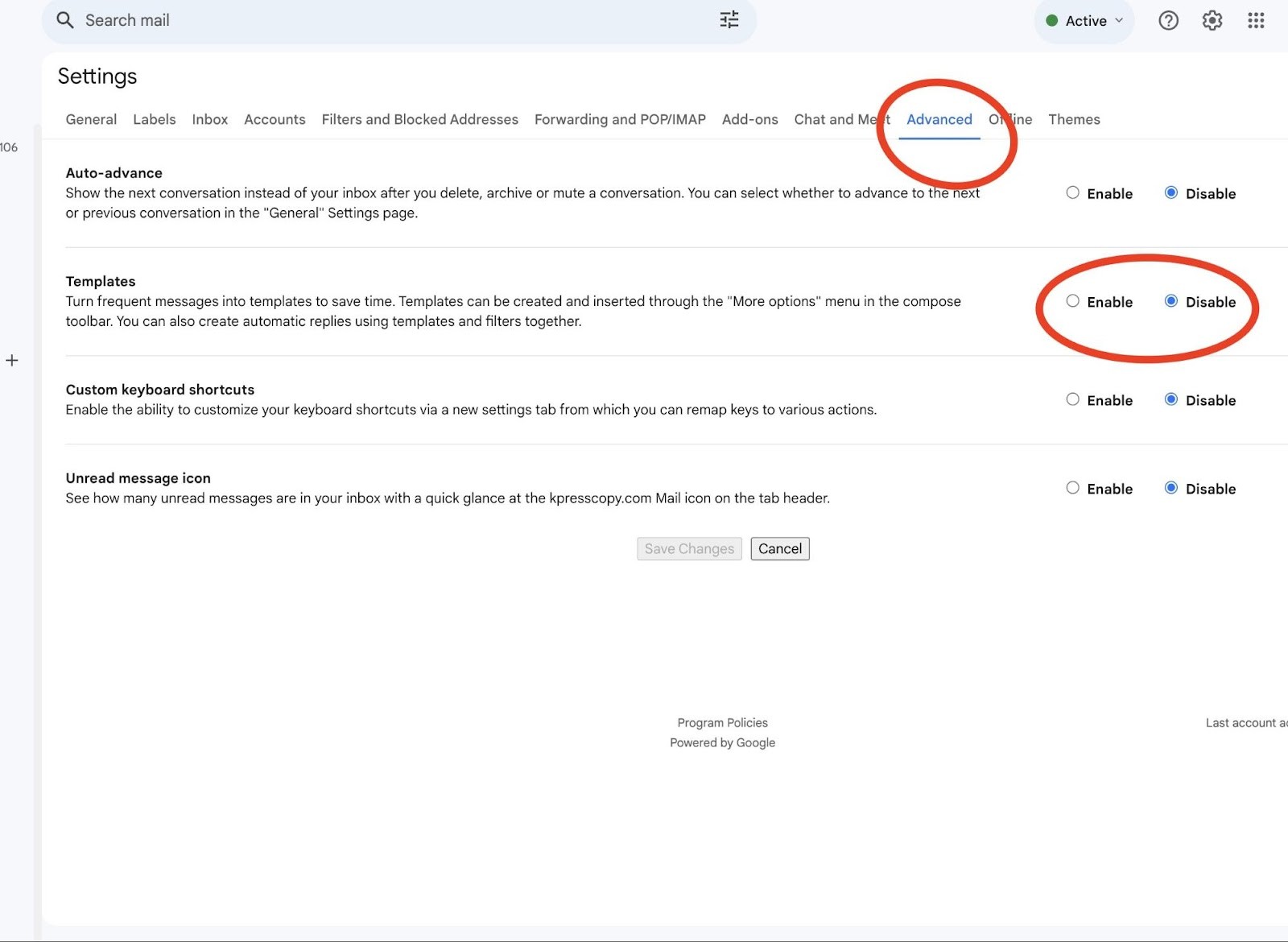Then click on "Advanced." Go to the section for "Templates" and toggle the "Enable" button.
