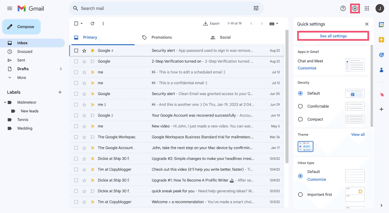 Just open up Gmail and click on the gear icon for settings. Then click on "See all settings."