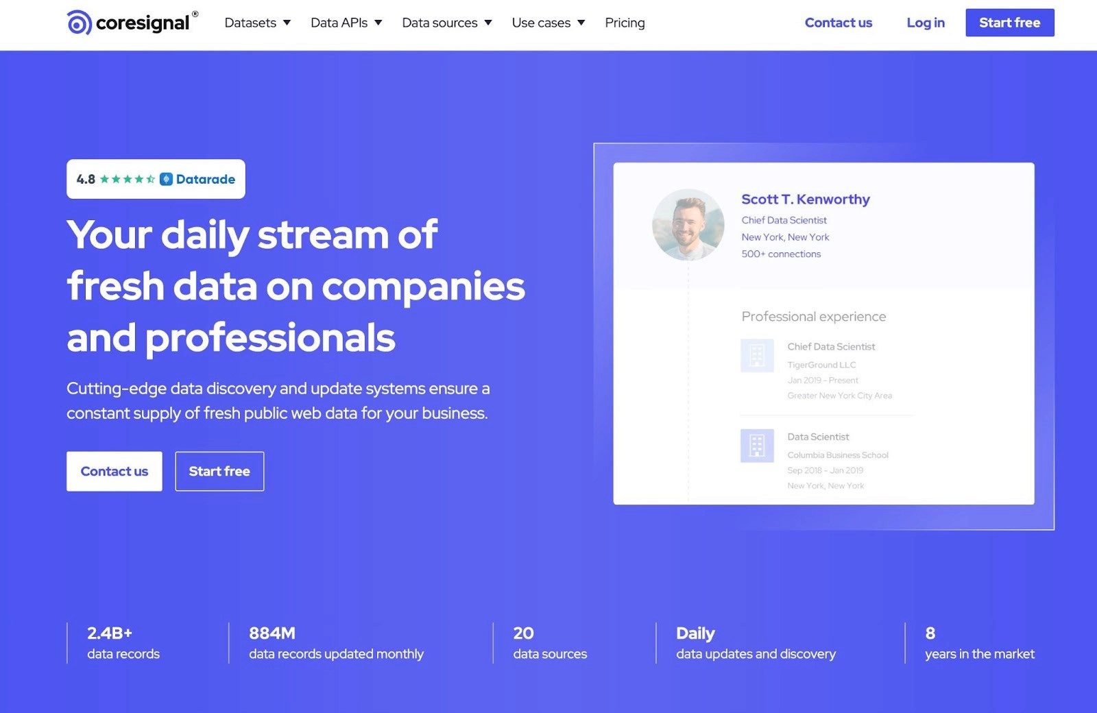 Coresignal is a software that collects professional network, job posting, firmographic data, and employee data from millions of data sets. They offer three ways to get the data you want: their Database API, raw data, or clean data.