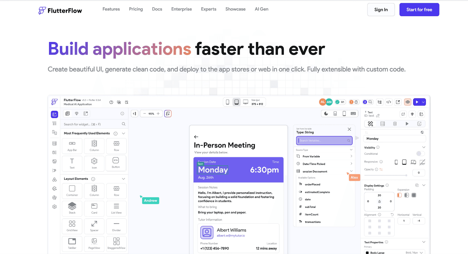 Key Features: FlutterFlow is a visual app builder for creating high-quality Flutter apps without coding. It provides a drag-and-drop interface, real-time previews, and extensive customization options, enabling users to build feature-rich mobile applications quickly. The integration with Google’s Flutter framework ensures performance and flexibility.