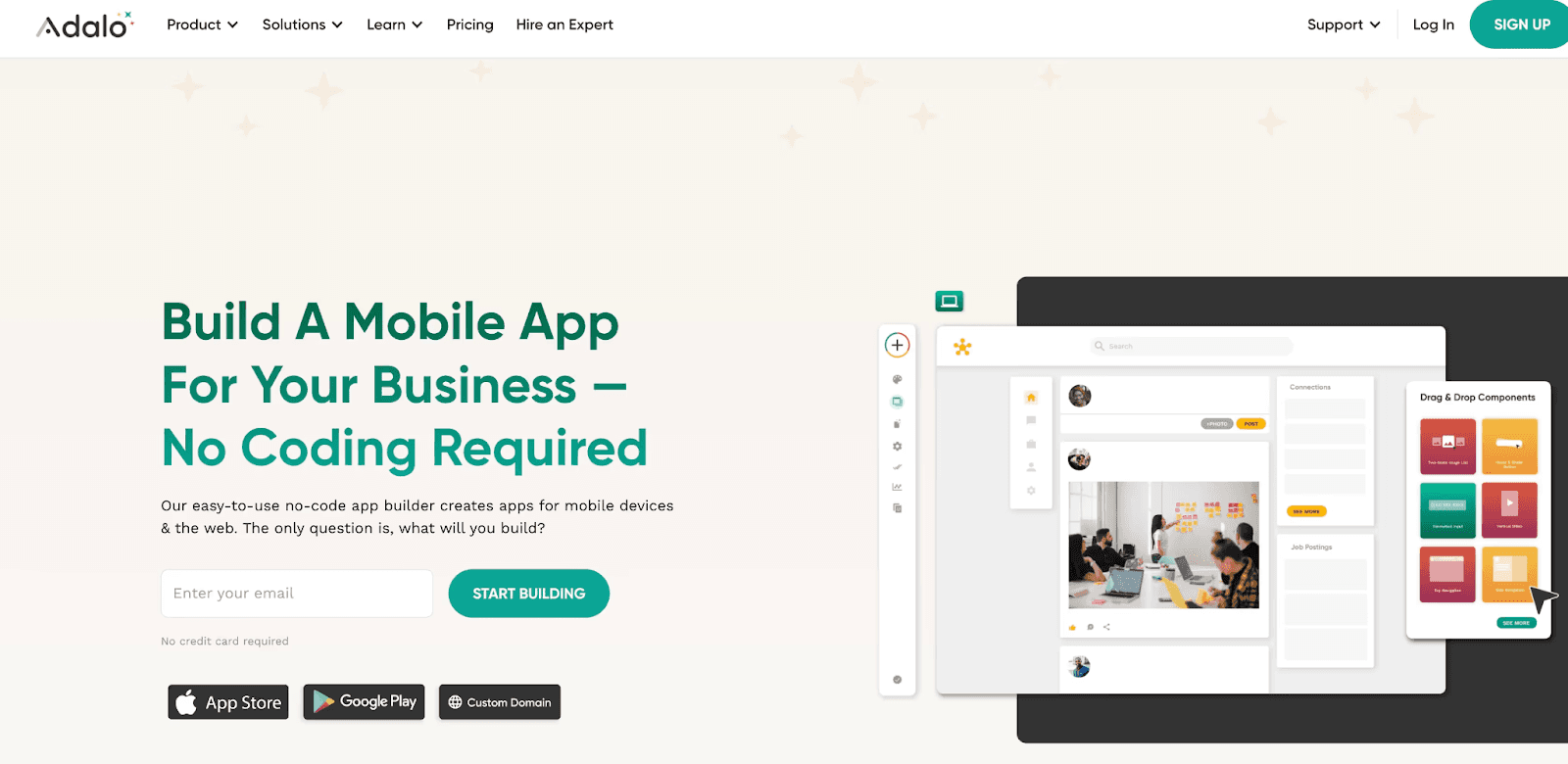 Key Features: Adalo is a no-code platform for building mobile and web apps with a focus on ease of use and design. It features a drag-and-drop interface, pre-built components, and database management, allowing users to create fully functional apps quickly. Its straightforward approach makes it ideal for creating MVPs and prototypes.