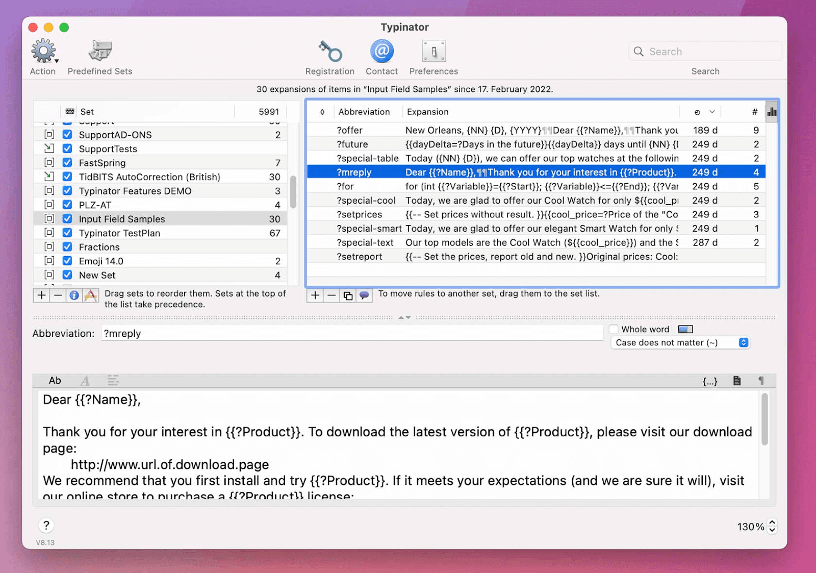 At its core, Typinator boosts productivity by allowing users to create shortcuts for frequently used texts and phrases. When a specified abbreviation is typed, Typinator automatically replaces it with the full text, phrase, or even complex formatted text and images. This feature is invaluable for reducing repetitive typing, especially for common responses, code snippets, or complex terminology.