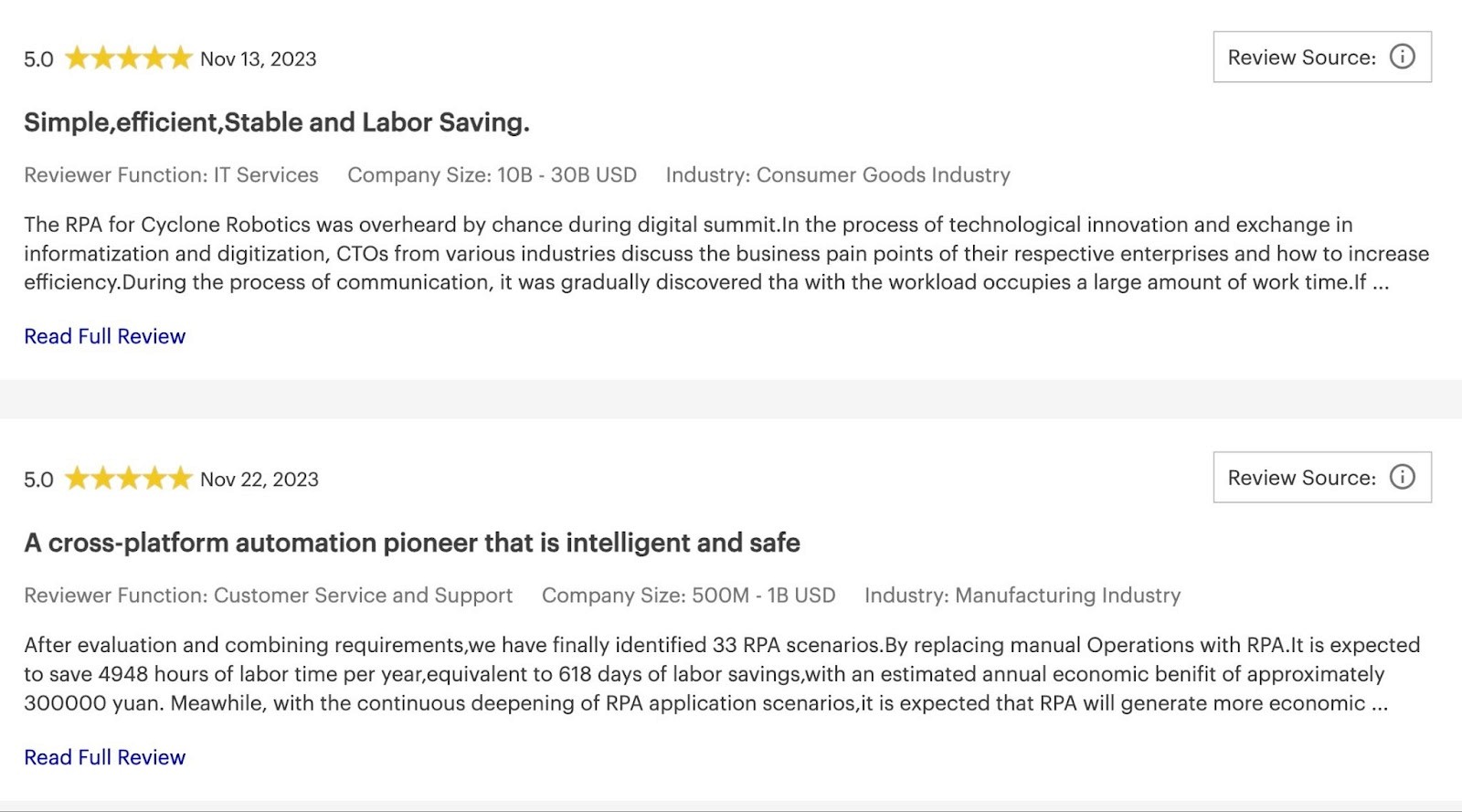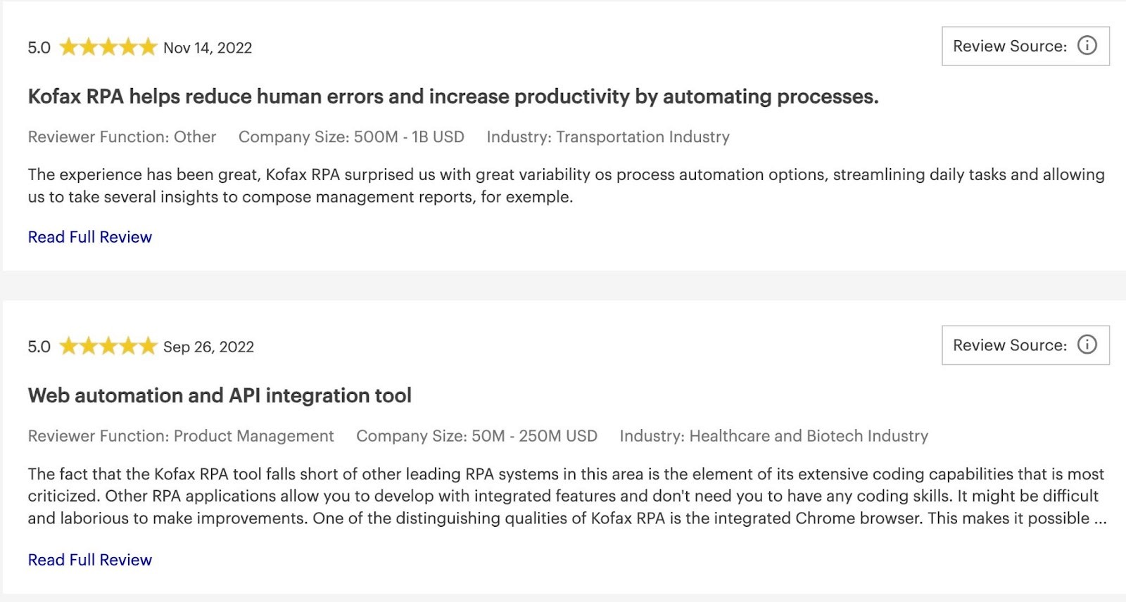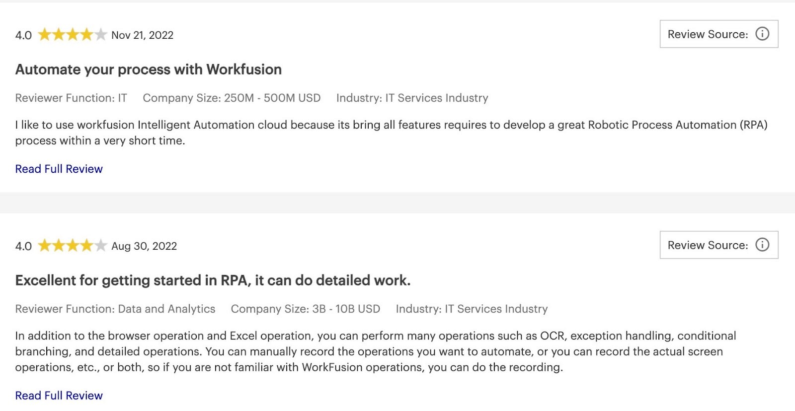 Automation use cases vary a lot, especially depending on your industry. If your industry involves a lot of paperwork, for example, it’s important to choose an RPA provider with intelligent document processing features. (When choosing an RPA tool, be sure to check out the vendor’s reviews and case studies. See if they’re experienced in deploying RPA in your industry.)