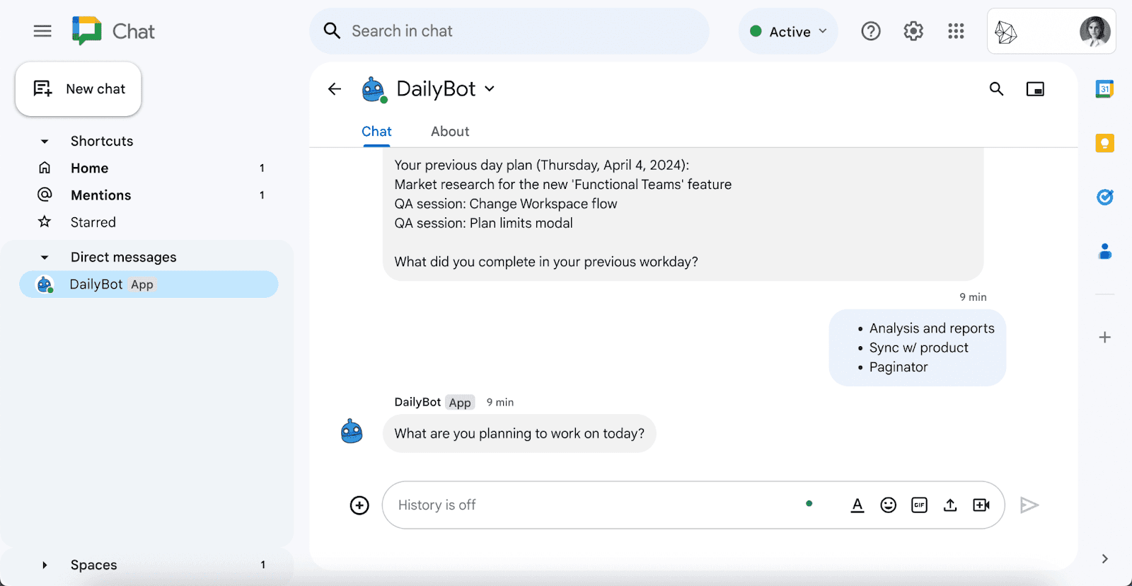 DailyBot facilitates automated check-ins and stand-up meetings within chat platforms like Slack, Microsoft Teams, and Google Chat. It offers mood tracking, kudos for team recognition, and customizable templates for various types of automated follow-ups and feedback collection.