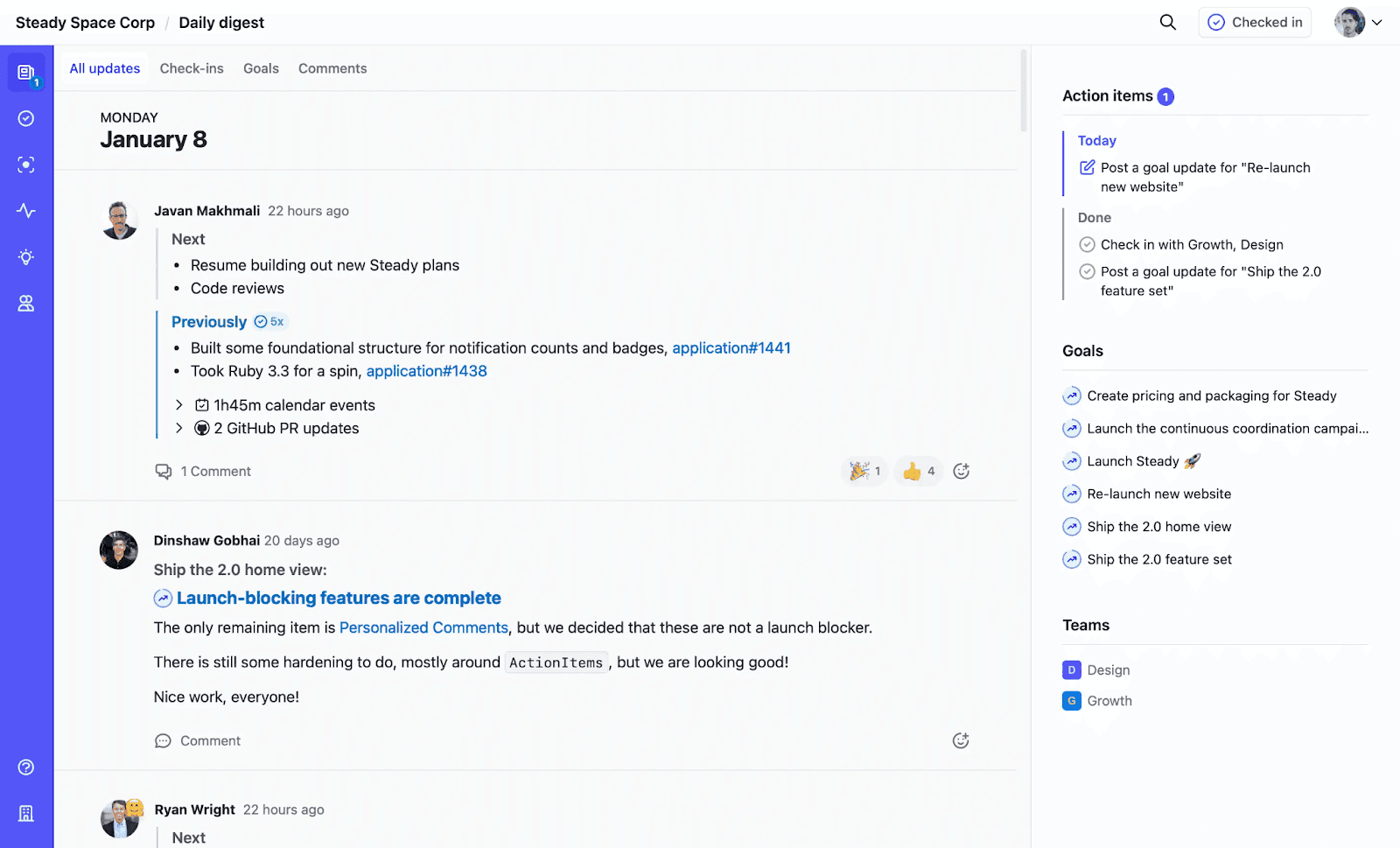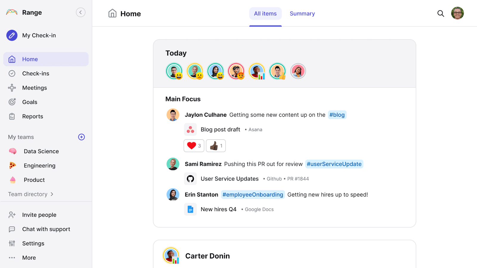 Range combines check-ins, objectives tracking, and team building within a single platform. It integrates with Slack, Microsoft Teams, and various project management tools, making it easier for teams to stay in sync and focus on what matters most.