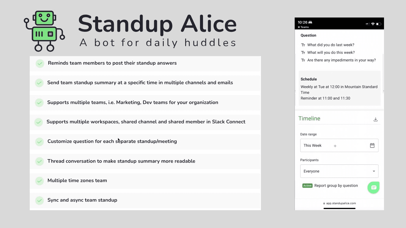 Standup Alice operates within Slack, offering customizable stand-up meeting automation. It supports various time zones for distributed teams and provides insights and analytics to help track team performance and issues.
