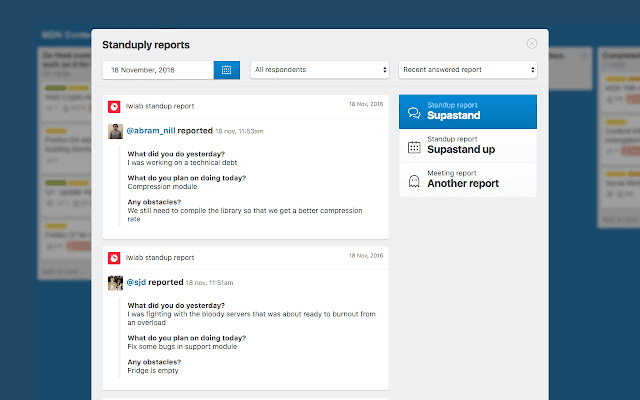 Standuply is a process automation tool designed to support Scrum Teams, including Scrum Masters, project and product managers, and technology leaders. Its main purpose is to support asynchronous events and automate key processes vital to Agile practices. 70% of companies report increased productivity with automated standup tools.