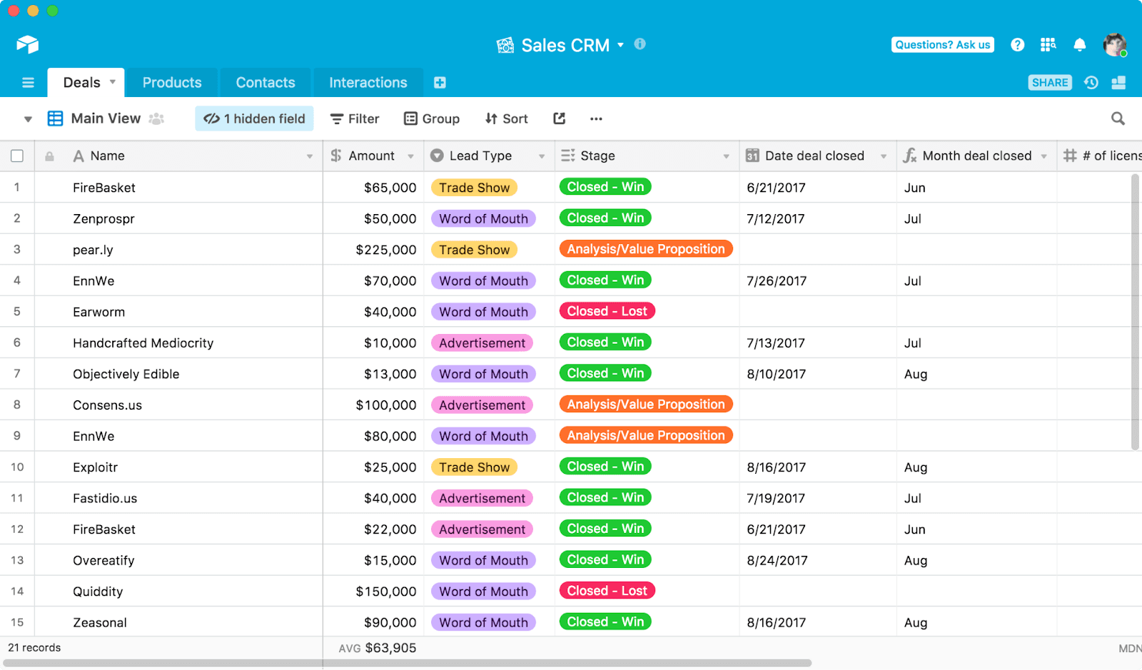 Very familiar spreadsheet layout and very easy to use and navigate user interface ,the search feature works well and very flexible when in comes to having different views to the same database the calendar view is especially very helpful when we need to keep track of clients orders, invoices and relationships. Other than the complexity of managing multiple views I honestly can't think of anything to complain about.