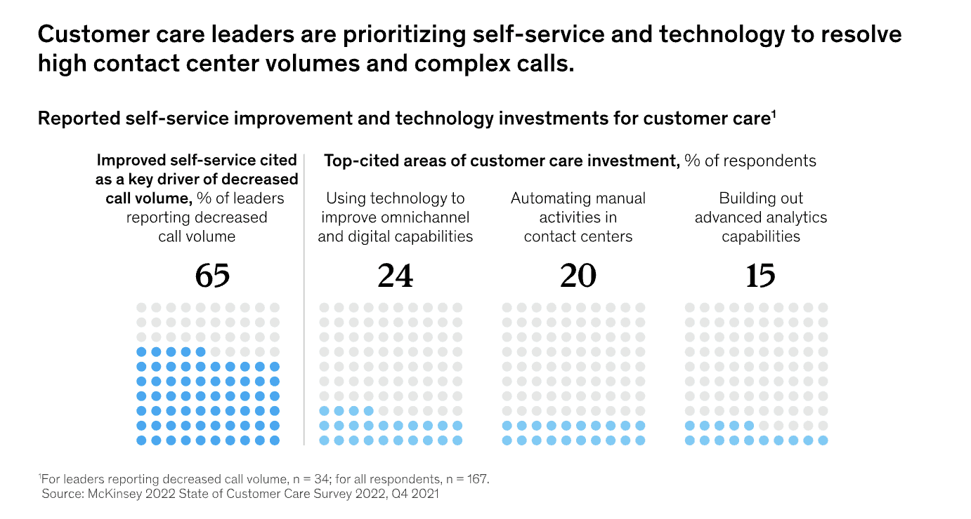 According to McKinsey's The State of Customer Care report, AI has a key role to play in solving the customer care challenges of many businesses, which include talent shortages, increasingly complex interactions, and higher case volumes. But as we discussed earlier, there's a range of AI technologies that can help you enhance your customer service function, from improving your self-service experience to predicting problems before they arise.
