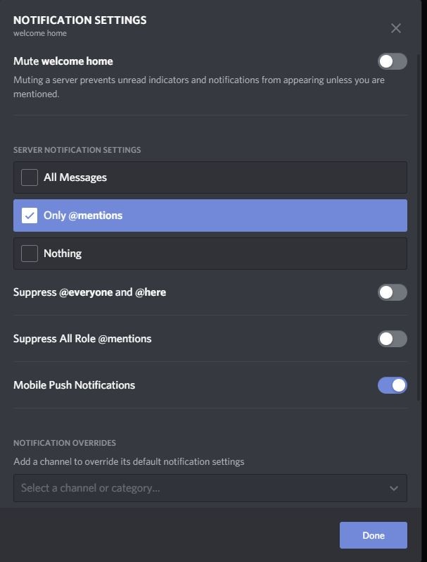 Here, you can choose to mute the server entirely, or customize your notifications for each channel.