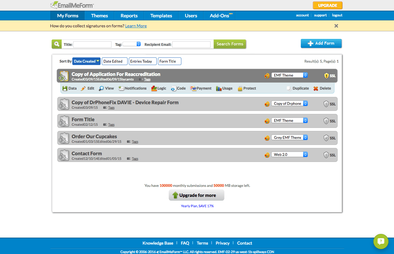 EmailMeForm's free version offers unlimited forms for one user, together with standard themes and support. The next level up (for two users) costs $8.95 a month for a year, or $9.95 monthly, which includes the form builder, reports, workflows, and 50 form entries a month.