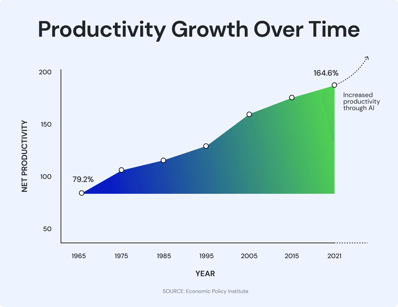 But you’ll notice that the graph ends in 2021. Gosh, that feels like a lifetime ago, doesn’t it? (It was a simpler time of “Squid Game” and sweater vests.) Since then, we’ve seen an absolute boom in artificial intelligence (AI) technology and apps like ChatGPT explode onto the scene. Experts are predicting that as AI continues to improve and become more used in business, it will usher in a new era of productivity.