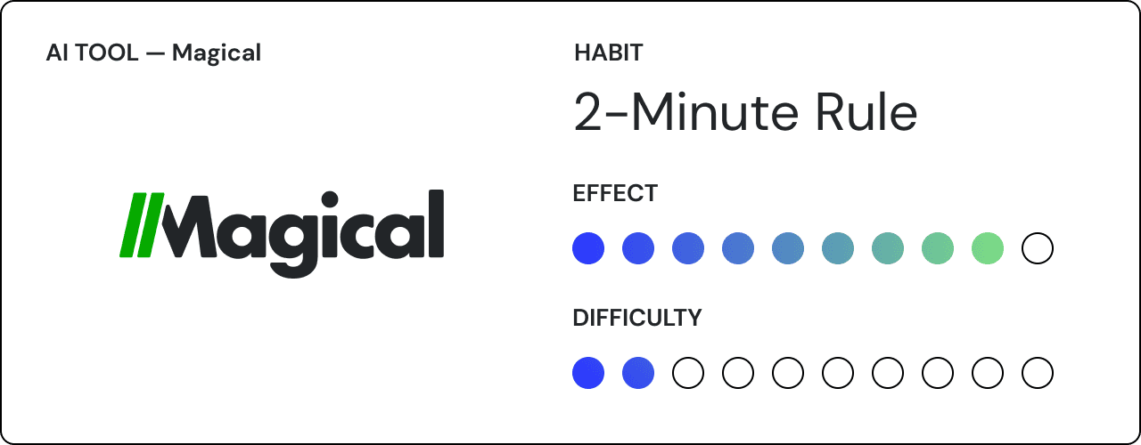 With an AI tool like Magical at your side, the two-minute rule becomes much more practical. Generative AI can do the heavy lifting here and write entire emails for you with the simple click of a button. Here are the step-by-step instructions on how to start building this habit: