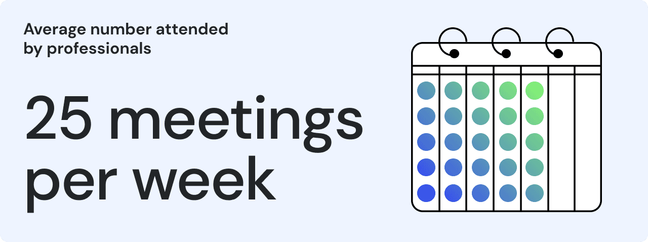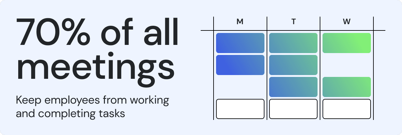 Think about all of the constant interruptions you face on a daily basis when you’re trying to actually get your work done. You have your daily stand-up meeting every morning. (Gee, you wouldn’t want to miss that.) But then you also have that client meeting at 11AM where they want to ask a bunch of questions about something or other. And don’t forget about the lunch and learn at 1PM. (Can they really call it a lunch and learn if they don’t provide any lunch? 😔) Oh, and of course you and your manager have your weekly check-in at 3PM. All-together, most people attend an obscene 25 meetings per week on average.