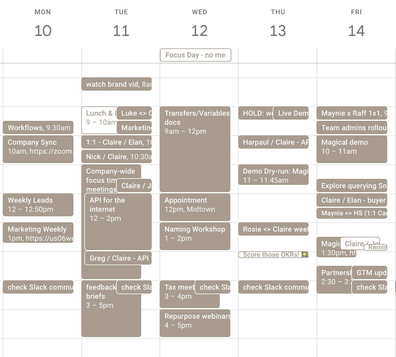 And then there’s all those other dang people you work with. Inevitably, they’ll book over your precious “focus time” for some important reason. (The audacity.) And so your careful time blocking and by extension your productivity falls apart, like a color-coded Jenga tower of meeting invites.