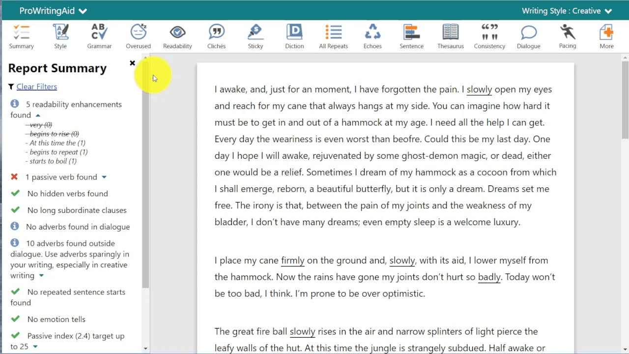With more than 20 different reports at your fingertips, ProWritingAid is your go-to tool for refining your sentence structure and selecting the perfect words. The integrated style checker and thesaurus provide you with the resources you need to craft compelling, polished prose in any situation.