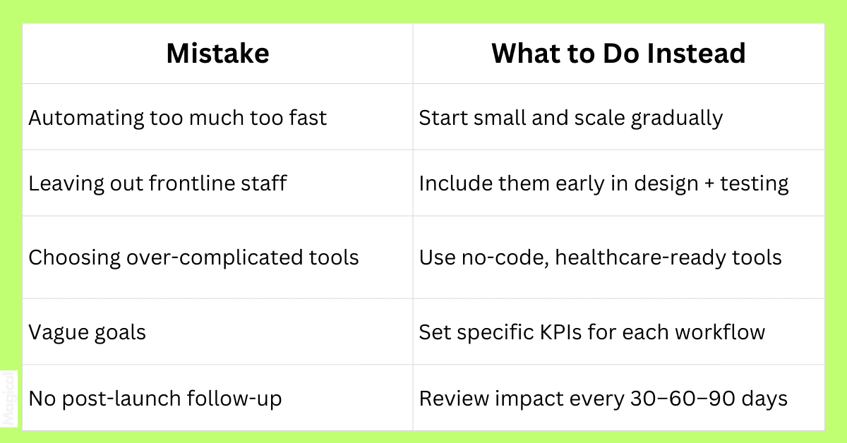 Don’t try to automate everything. Pick one or two high-friction workflows and automate those first.