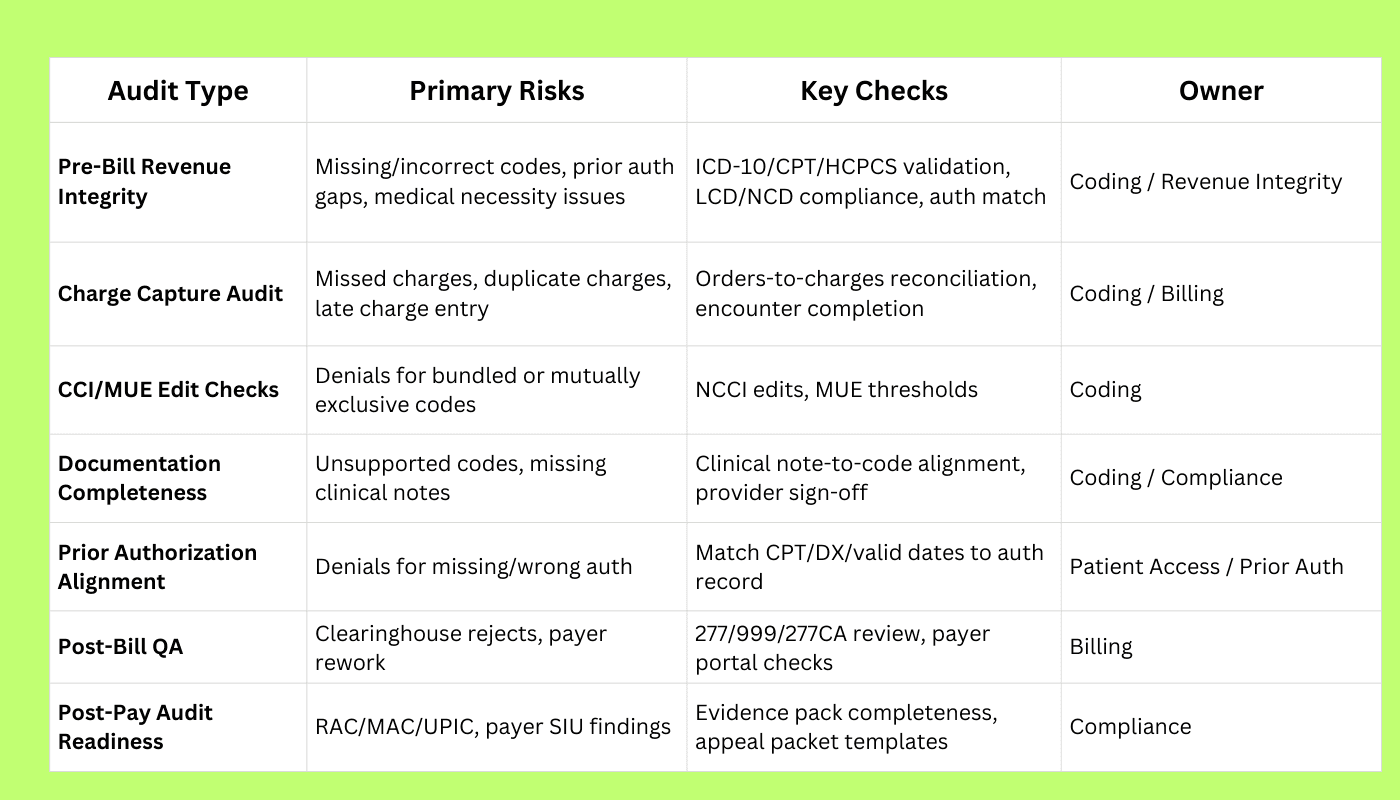 Pre-bill audits – Internal revenue integrity checks before a claim is sent. These verify coding accuracy, medical necessity, and required attachments.