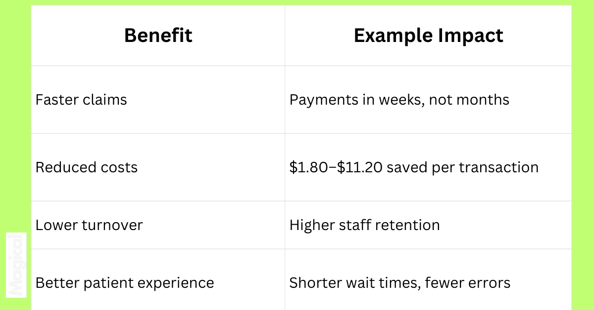 A CAQH analysis found the average savings per automated healthcare transaction is $1.80–$11.20, depending on complexity. Multiplied by thousands of transactions per month, those savings add up fast.