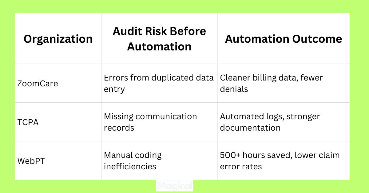 Audit risk isn’t hypothetical. Clinics and healthcare organizations face it every day. By integrating automation, several teams have already reduced their exposure and improved billing accuracy.