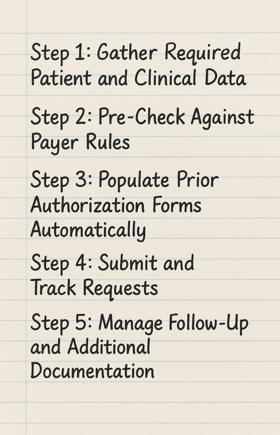 By automating the repetitive steps (data gathering, form filling, submission, and tracking), your team can move requests through faster, with fewer denials and less burnout.