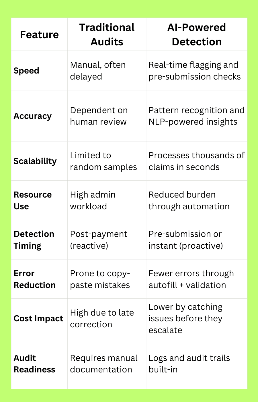 Let’s make this simple. Here’s how traditional fraud detection stacks up against AI-powered workflows used by modern healthcare admin teams.