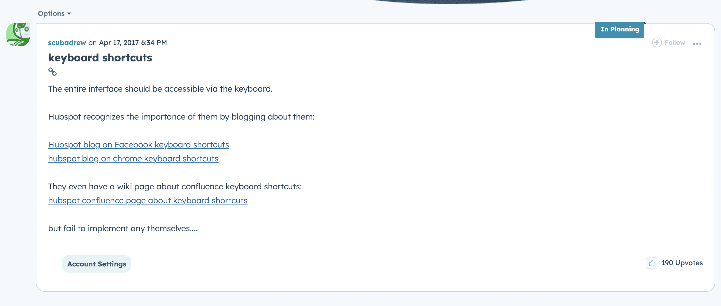 Unfortunately, HubSpot doesn't have any keyboard shortcuts or hotkeys to help you get around faster. This much-requested feature is still missing from the platform, despite user complaints.
