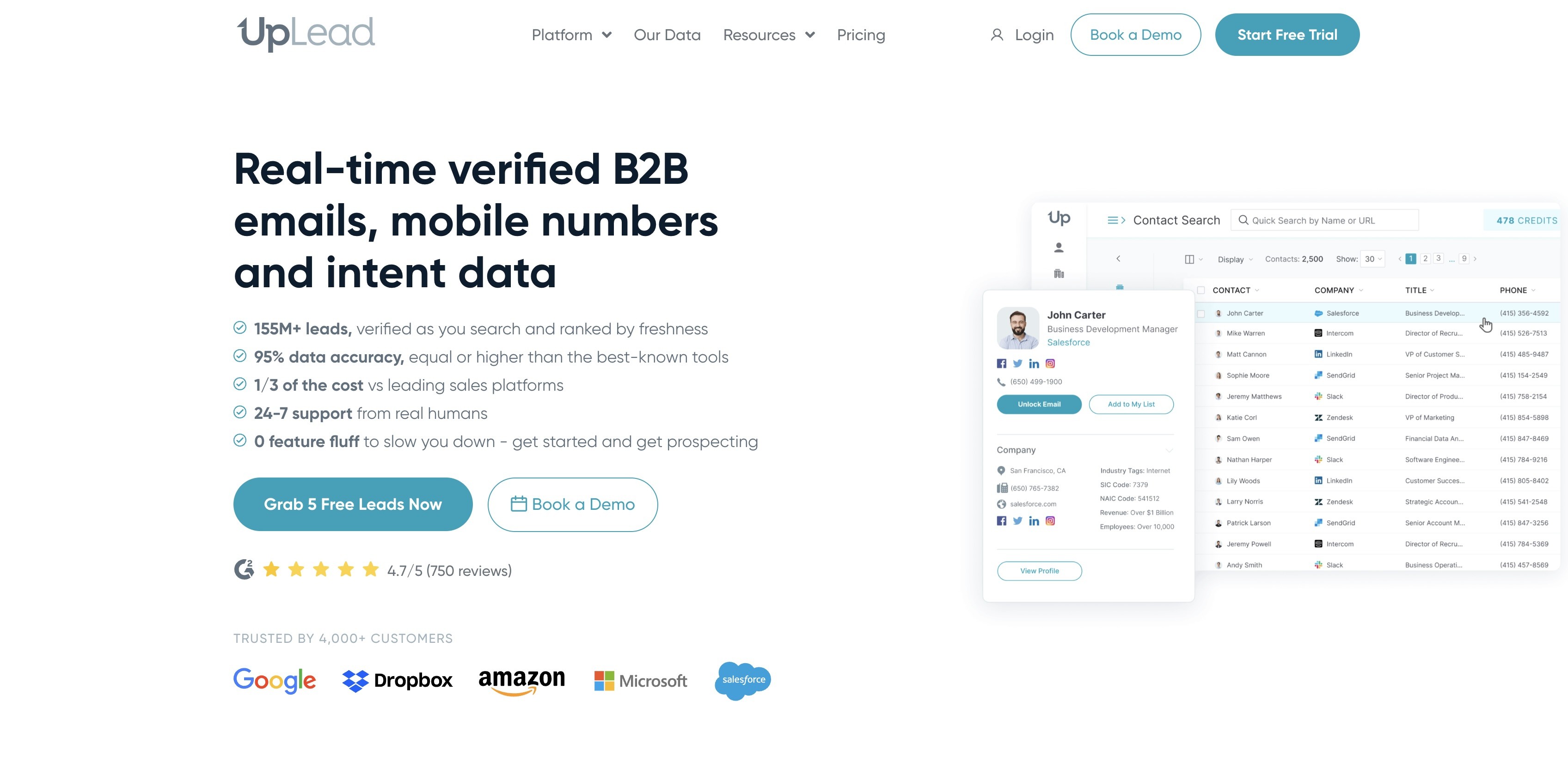 First up on our list of Hunter.io alternatives is Uplead, an all-in-one lead generation tool that offers a wealth of features and data enrichment capabilities. With Uplead, you can quickly find and verify email addresses, phone numbers, and other key contact information for your leads.