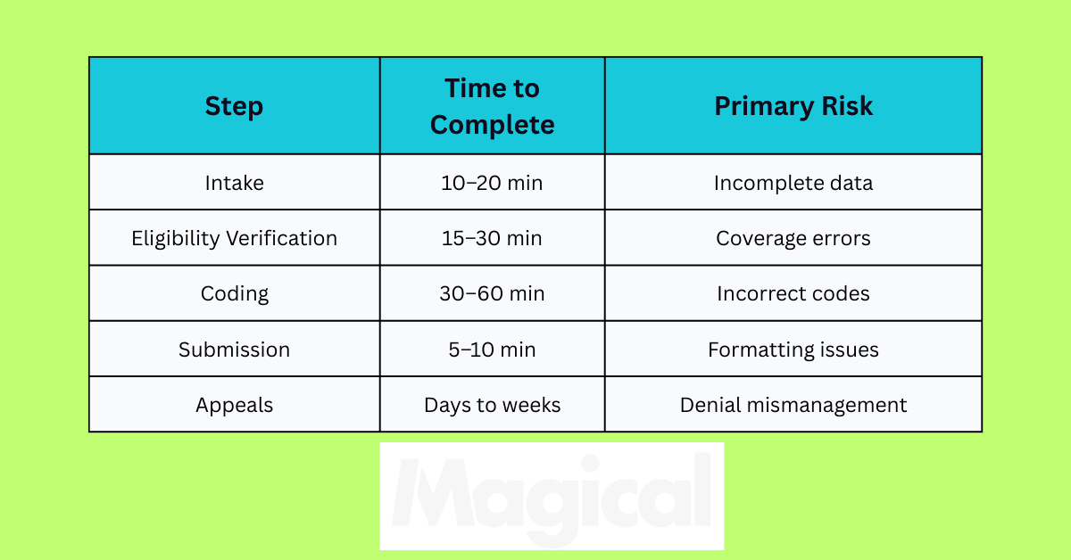 Coding and documentation → clinical data is translated into CPT/ICD-10 codes, often manually.