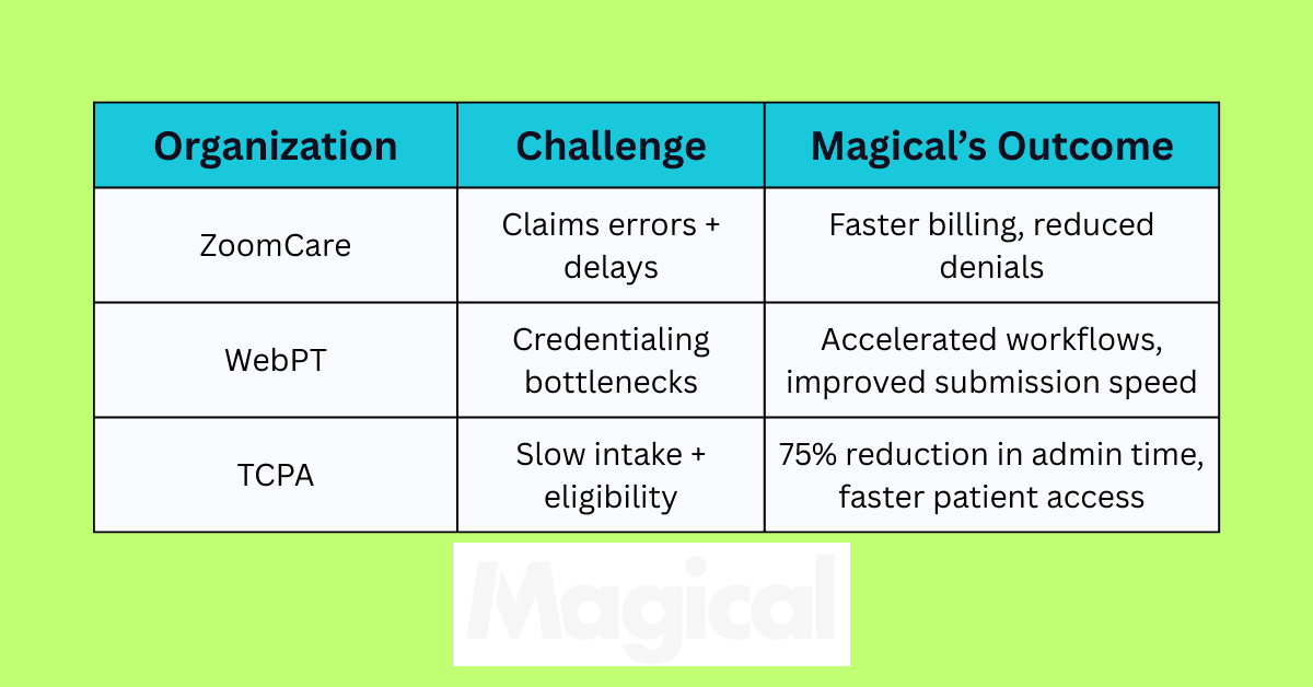 Case in point: WebPT implemented Magical agents to streamline credentialing and eligibility workflows—without disrupting their day-to-day operations.