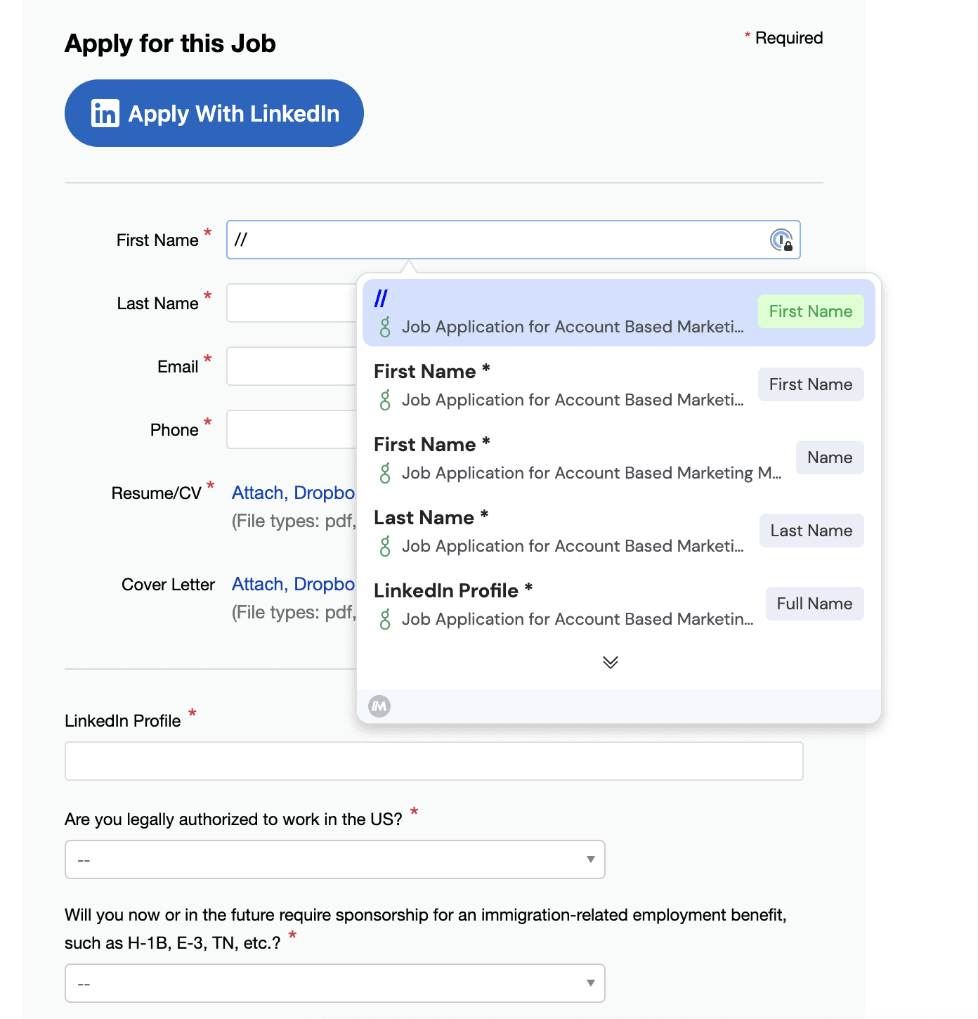Initiate autofill: When you're on a job application form, you simply need to initiate the autofill tool. This could be by clicking a button or using a specific command. (In Magical, you can just hit “//” to activate your autofill.)