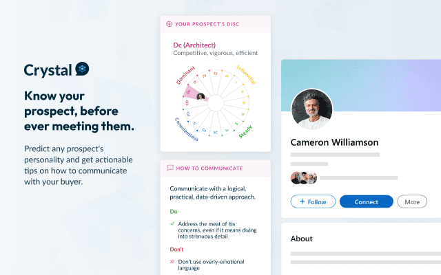 Pros: What I like most about Crystal: - The accuracy of the profiles is spot on - It helps me craft an email/message based on how the other person will receive the information - My response rate has increased. Cons: The only negative is the lack of integration with Outlook.