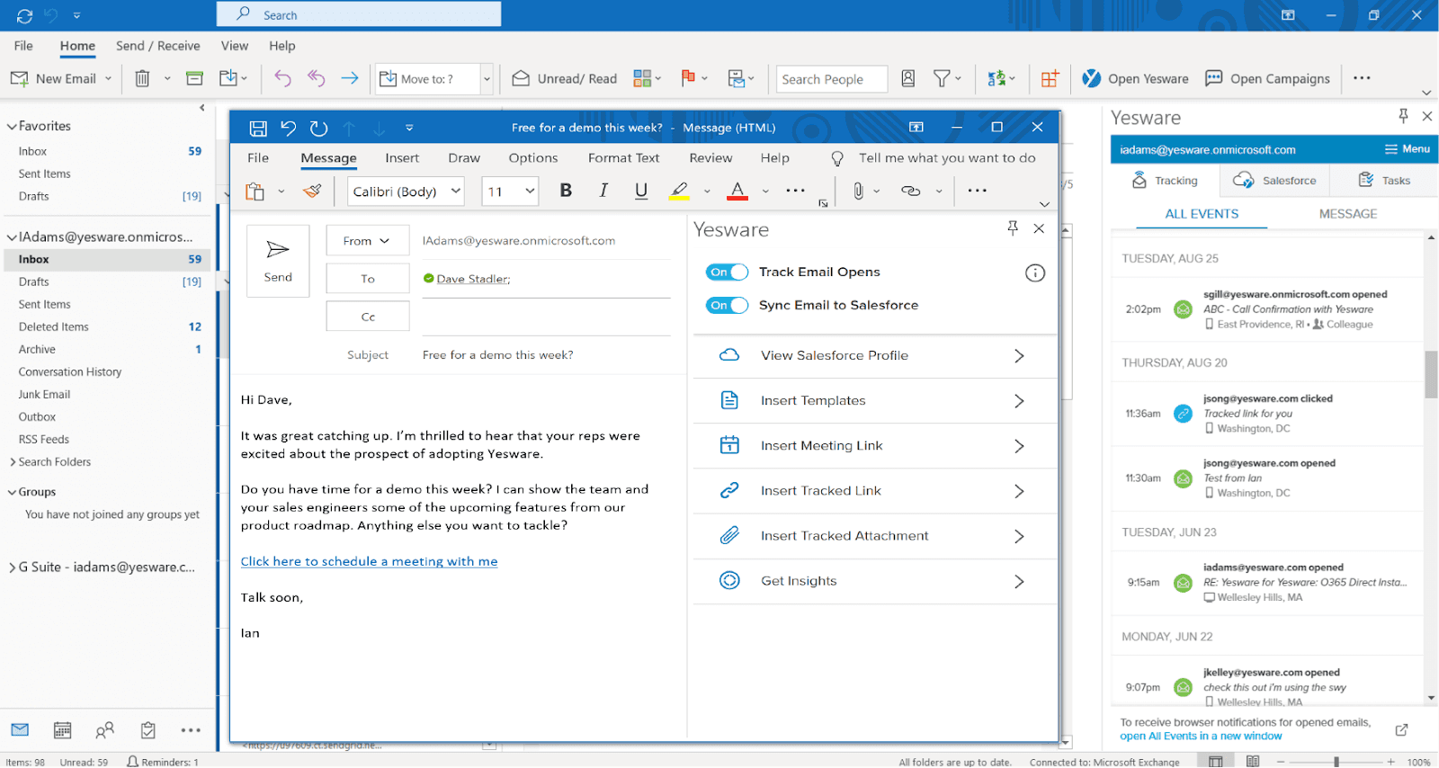Overall: Despite the bug that keeps saying there is an issue with the compatibility with Google Workspace, Yesware is very user-friendly compared to other software. It eliminates the need to use different email marketing software to create emails, respond to emails, and the creation and use newsletters because it can all be done within your email account. It is GDRP-compliant so you can rest assured, you are working within compliance and email servers limitations. Pros: There are many useful resources that Yesware can integrate with, including ones that you might already be using. Personally, I find the integration with my Google Workspace email and Salesforce to be particularly helpful.