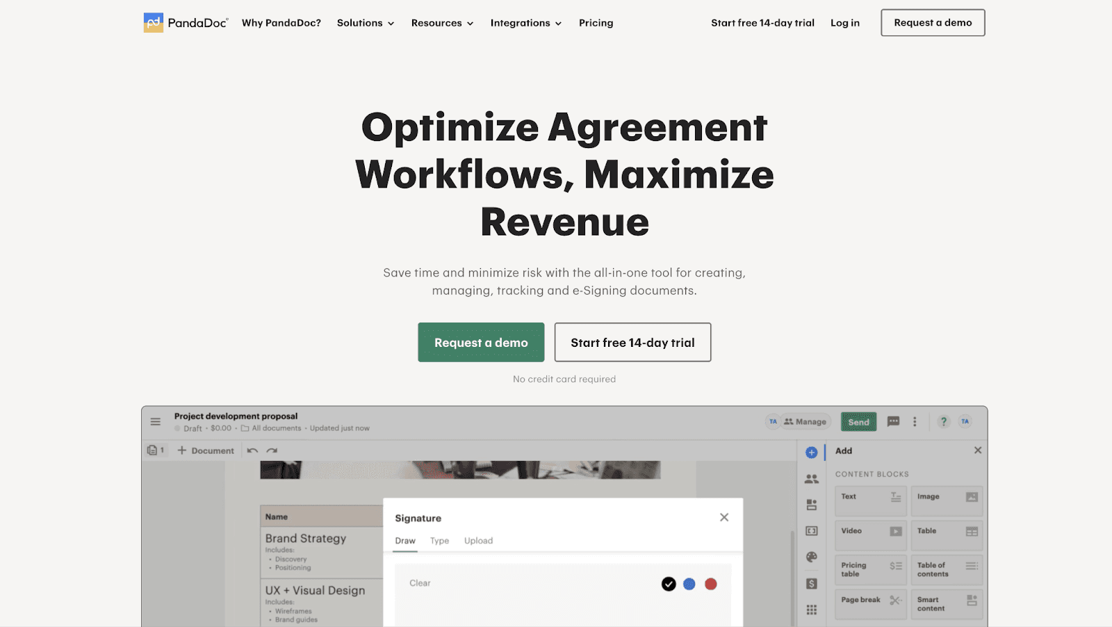 PandaDoc is an automation software that lets you create and send proposals to your clients. They even have a feature that allows for eSigning. Known for its user-friendly interface and comprehensive features, including payment processing, CRM integrations, and customizable templates.