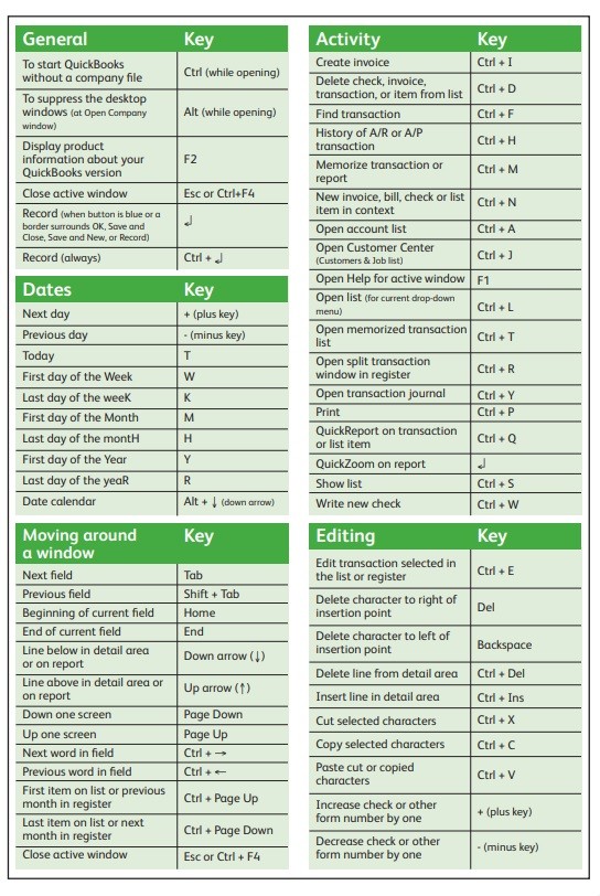 Like the shortcuts you might use in excel tips tricks shortcuts, these advanced QuickBooks shortcuts can radically enhance your productivity once you've mastered them. Check out the image below from Fintech college for the complete list of shortcuts: