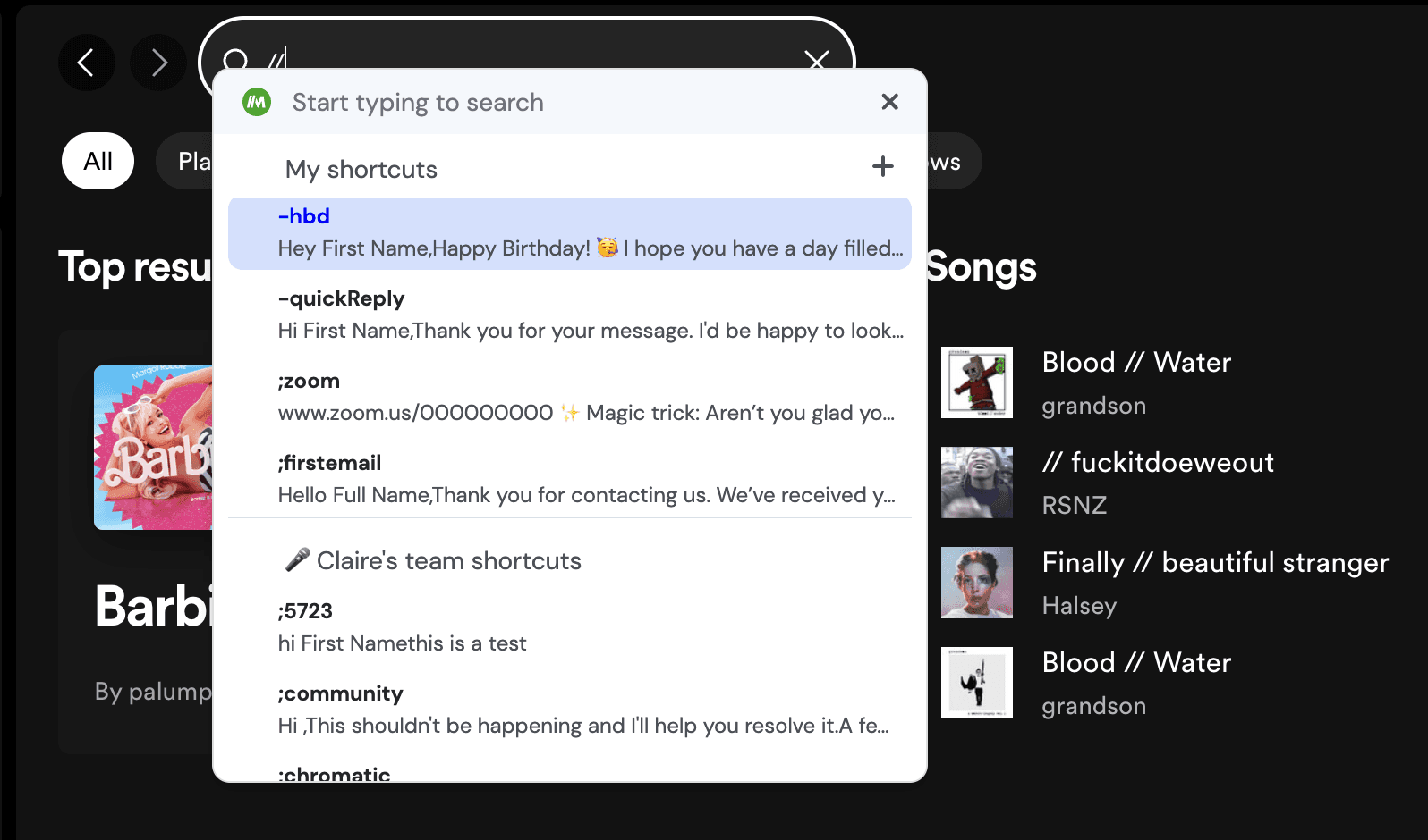 Spotify search notoriously kinda sucks. If you're sick of copying and pasting long playlist names or artists into the search bar, you might want to try downloading the free Magical Chrome extension. With Magical, you can save your favorite bands, playslists, and songs as templates and call them up anytime by simply typing "//" into the Spotify search bar. Handy! (You can also use Magical templates to save message templates to use in your emails, and to automate repetitive tasks like data entry.)
