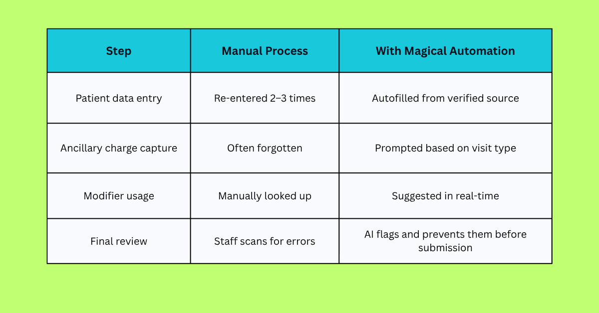 Magical helps healthcare teams prevent failed charges by automating the billing work thatโs most vulnerable to human error. No more missed fields. No more unbilled services. No more โweโll catch it later.โ