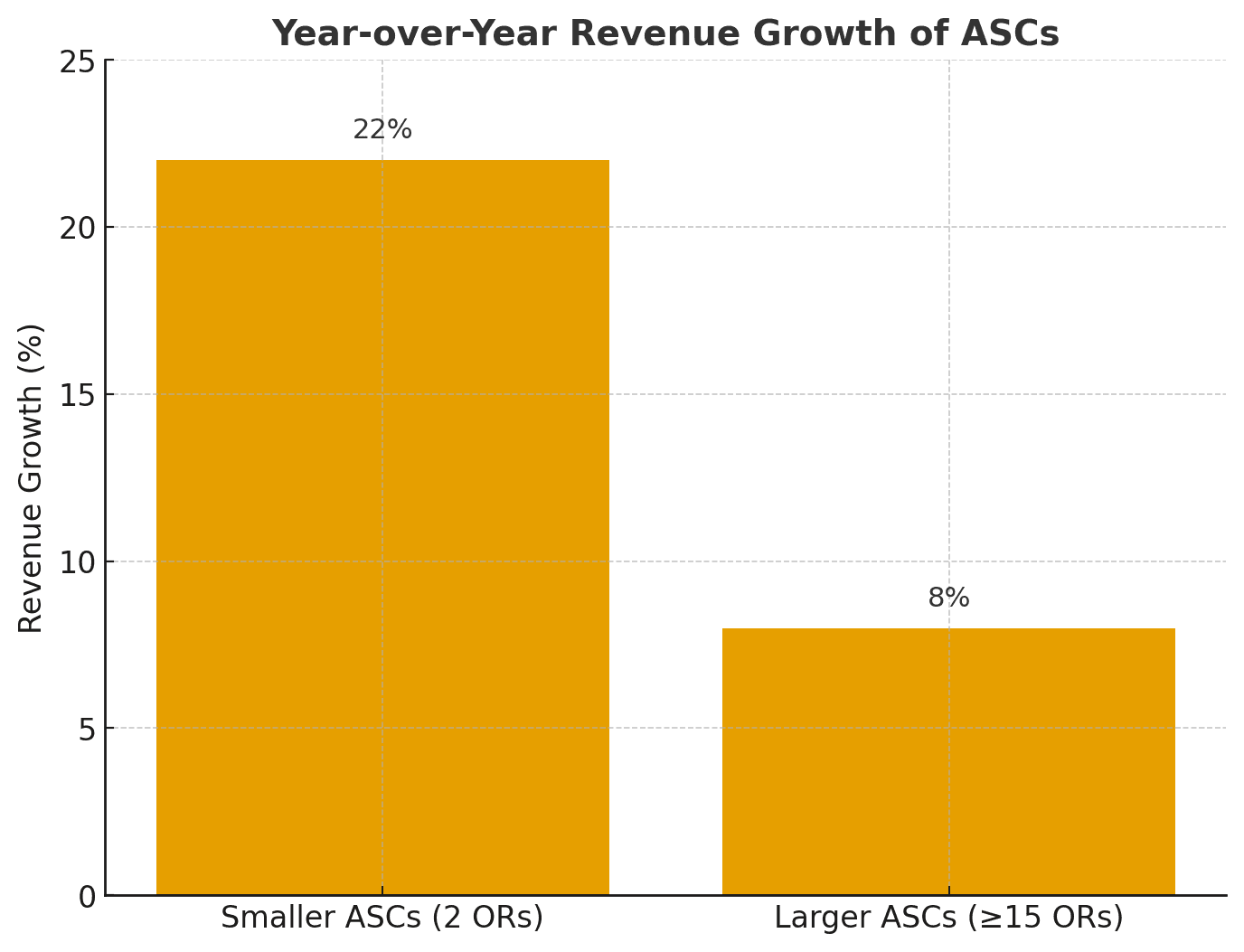 Orthopedics is embracing the move toward ASCs (ambulatory surgical centers). ASCs often offer lower overhead, faster throughput, and greater flexibility compared to hospital ORs. A recent report by ASC News noted that smaller ASCs (with two operating rooms) saw revenue grow ~22% year-over-year, while larger facilities with ≥ 15 ORs experienced only ~8% growth in the same period.